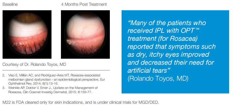 M22™ combines Intense Pulsed Light (IPL) with unique Optimal Pulse Technology (OPT™), and is FDA cleared for 20 different skin indications, including rosacea and other skin inflammatory conditions.